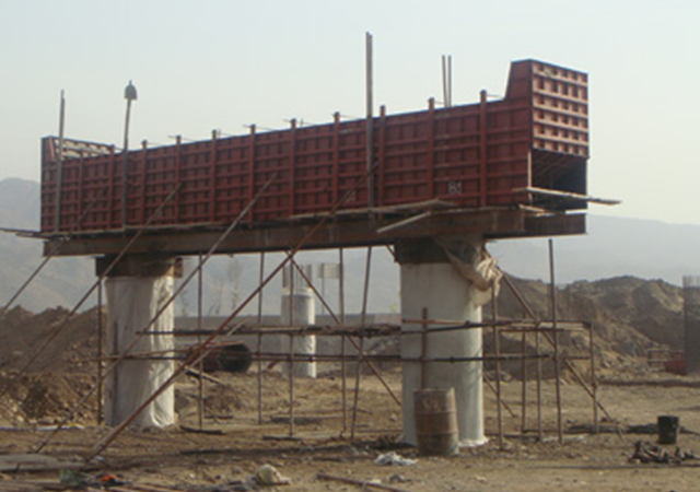 蓋梁模板采用托架法現(xiàn)澆,模板采用大塊組合鋼模,利用預(yù)留的孔洞安裝托架縱橫梁,在橫梁上拼裝好底模。然后先綁扎蓋梁鋼筋,經(jīng)監(jiān)理工程師檢查合格,再拼裝兩側(cè)的模板。